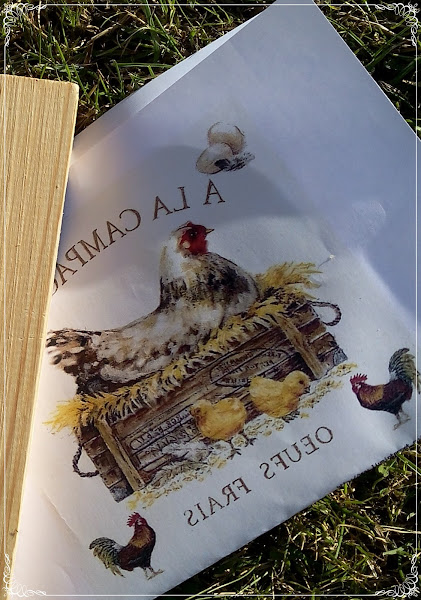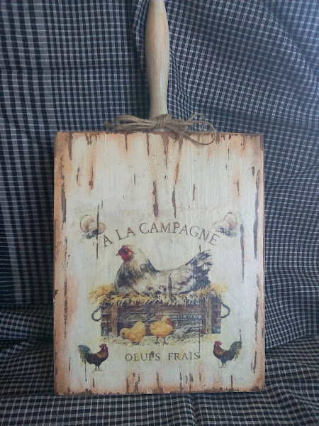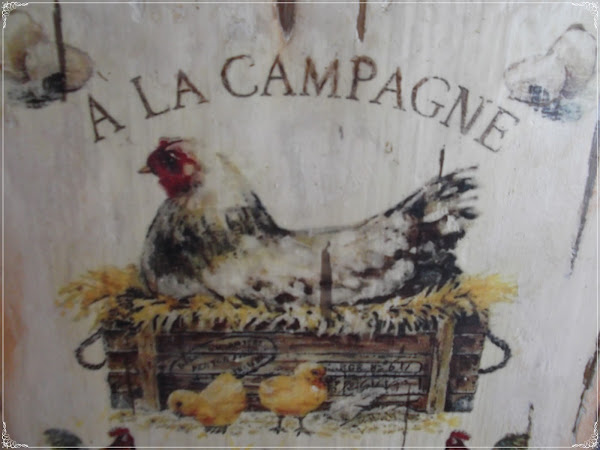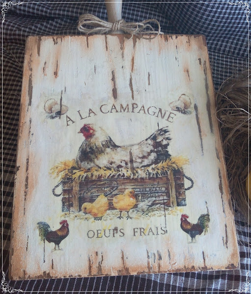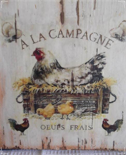 Para el reto, he adornado unos huevos de poliespam o porex y una tabla de cocina con imágenes de gallinas. Creo que gallinas, gallos y pollitos,campestre desde luego si que son ¿no os parece?