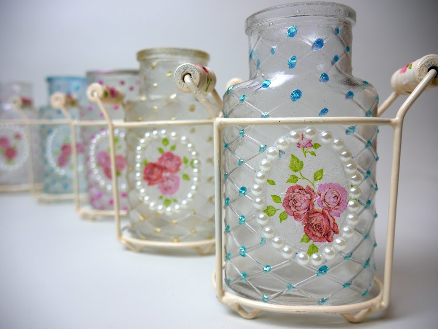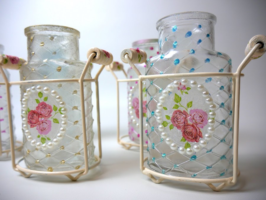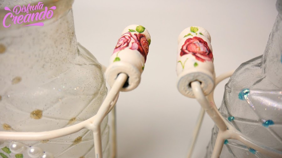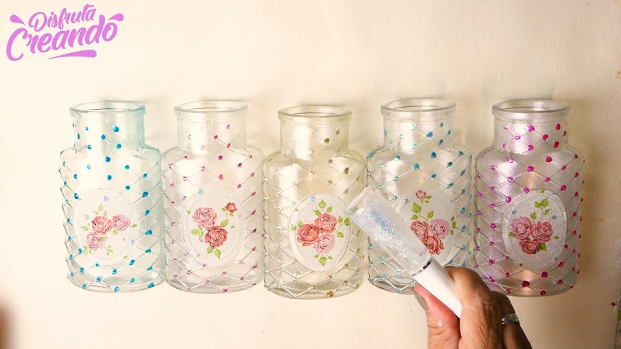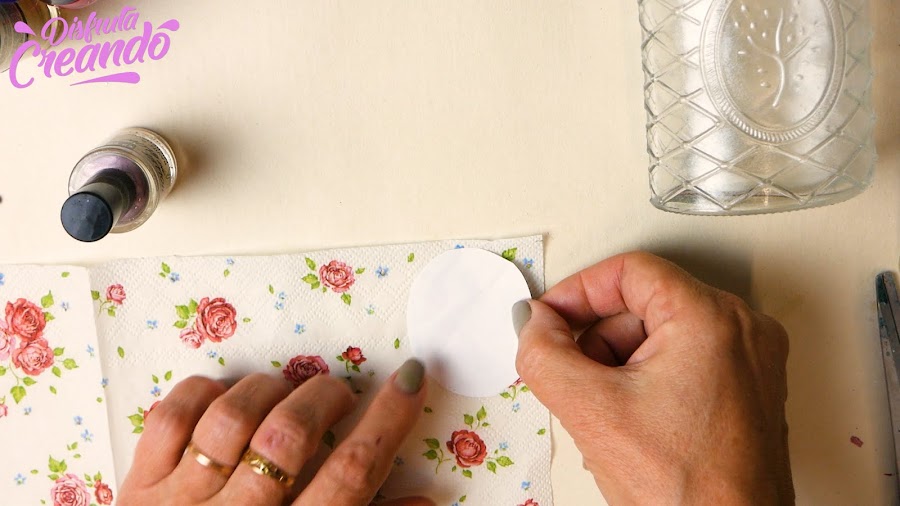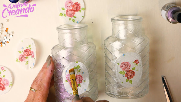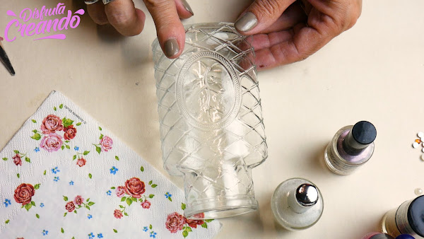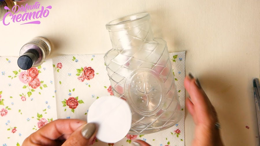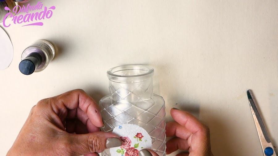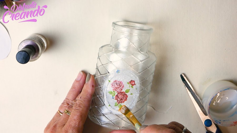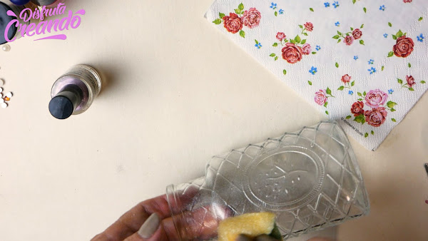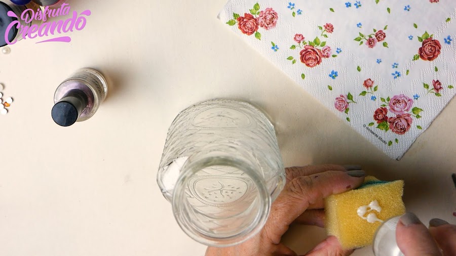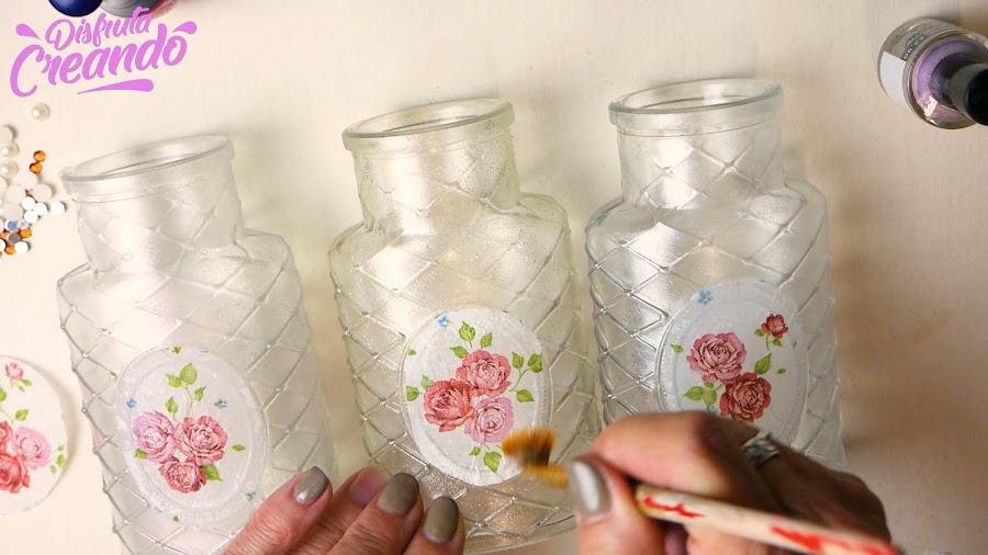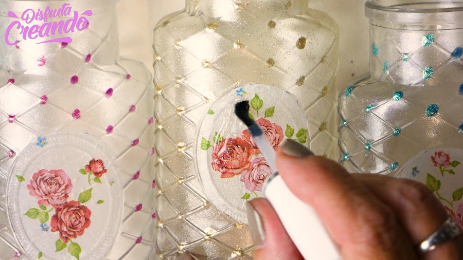 Así procedo con todos los frascos que ya previamente esmerilé con distintos esmaltes, pero la servilleta de decoupage que uso es siempre la misma, lo que va a ir variando es el esmerilado.