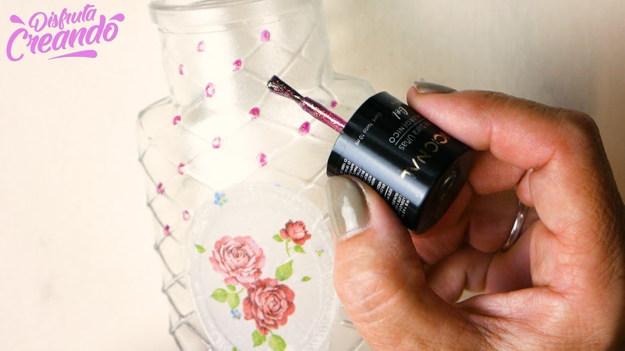 El paso que sigue es realizarles con esmalte pequeños puntitos alrededor del frasco, en mi caso lo hice en la unión de los rombos marcados en el vidrio pero de todos modos esto no es necesario, pueden hacer éstos lunares distribuidos en forma pareja o no en cualquier frasco.