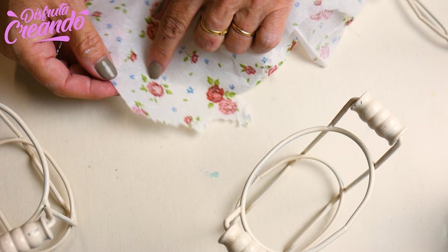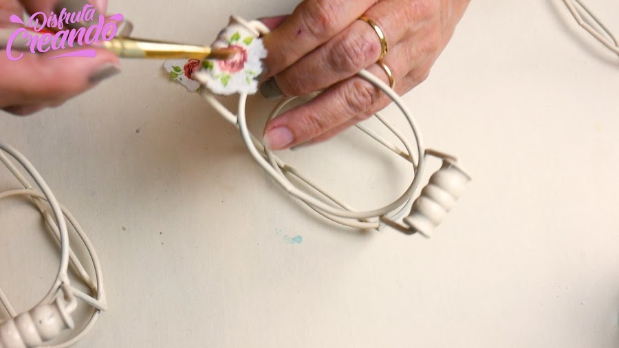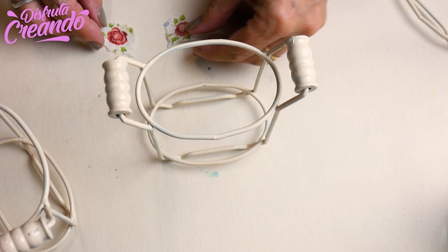 Una vez que se han secado las canastitas de alambre voy a adornar las asas de las mismas con la misma servilleta.