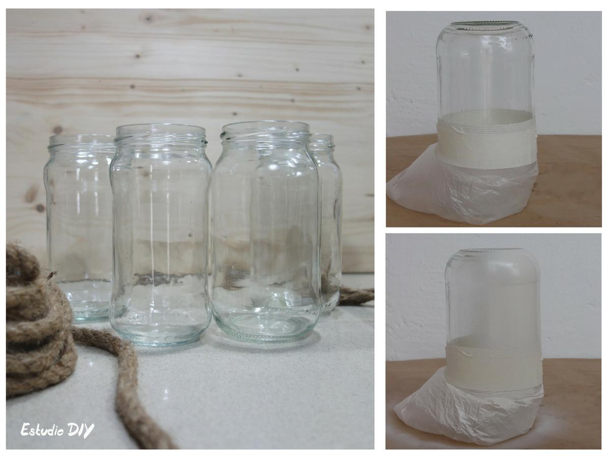 Para no manchar el resto del tarro, cubrir con una bolsa de plástico sujeta con cinta de carrocero. Repetimos este proceso con todos los tarros que queremos transformar.