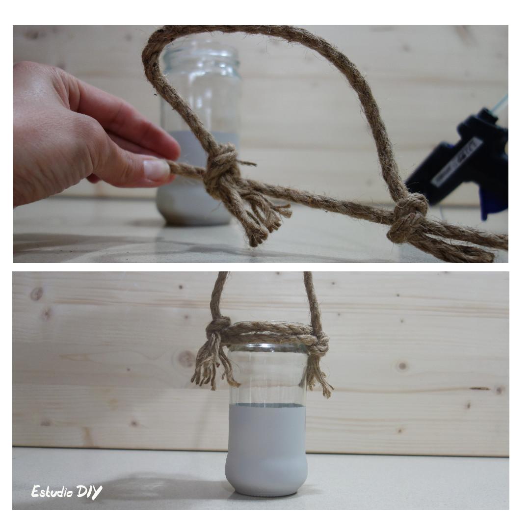 Una vez hecha el asa, vamos a rodear la boca del tarro comenzando por el extremo más pequeño. Daremos dos vueltas y fijaremos con silicona caliente. Hay que poner la cuerda de manera que cada extremo quede escondido detrás de los nudos del asa.