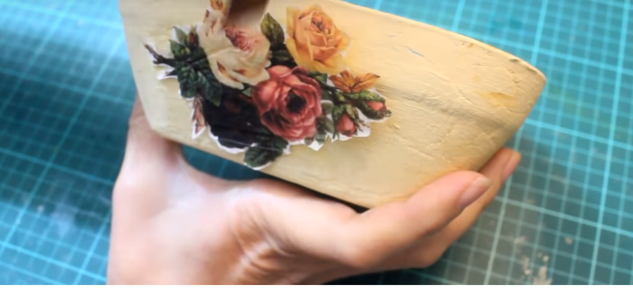 Pegamos las figuras que hemos reservado con pegamento para decoupage y finalmente protegemos el exterior con barniz.