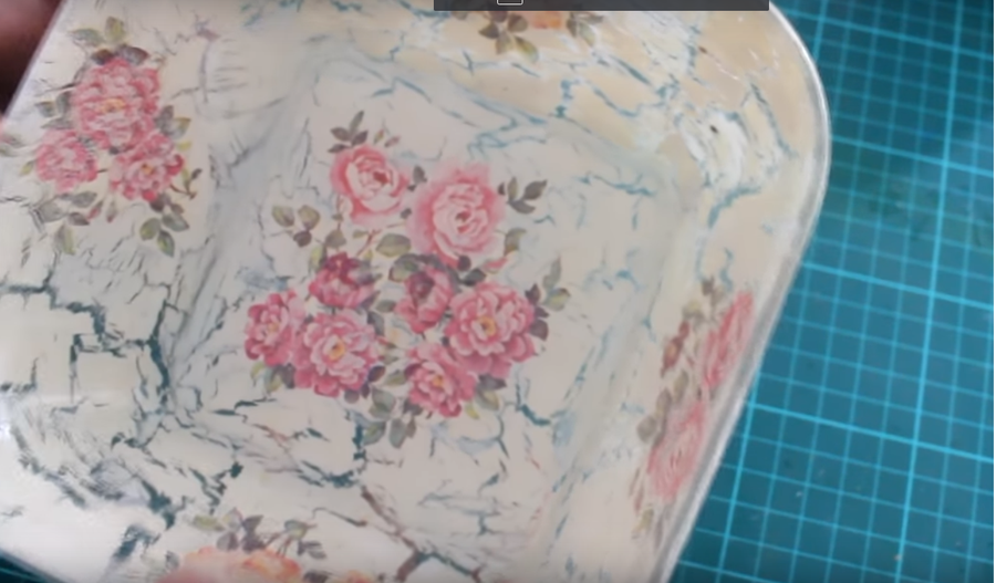 Cuando la pintura oscura está seca, volvemos a pintar con una pintura clara para que podamos hacer nuevamente el decoupage sobre el exterior del recipiente.