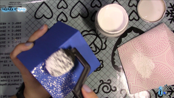 Luego pinto todo el bote de azul, con una pintura acrílica normal, dando dos capas para que quede bien cubierto. Y cuando ha secado utilizo un rodillo de textura para, utilizando pintura blanca y descargando mucho el rodillo, hacer pequeñas manchitas blancas... como imitando la espuma que sale en el mar con las olas.
