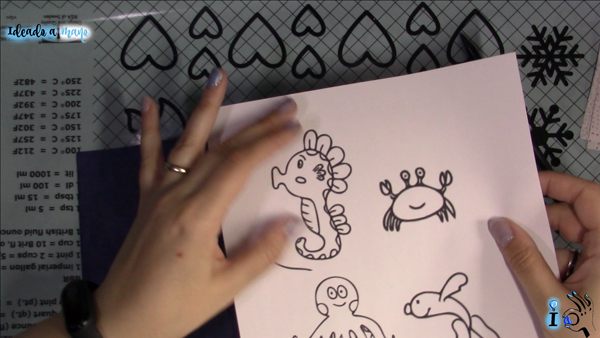 Cuando se ha secado voy a calcar encima estos cuatro simpáticos animalitos marinos. Son los acompañantes de los sirenos y sirenas de MyTinkerCrafts, que hace unos diseños digitales super bonitos.