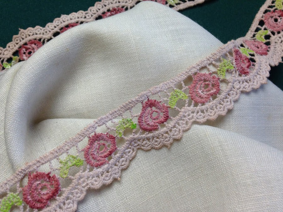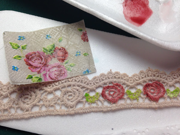 La puntilla teñida la pinte con acrílico del mismo color que las rosas de la servilleta.