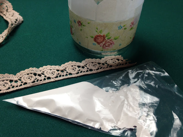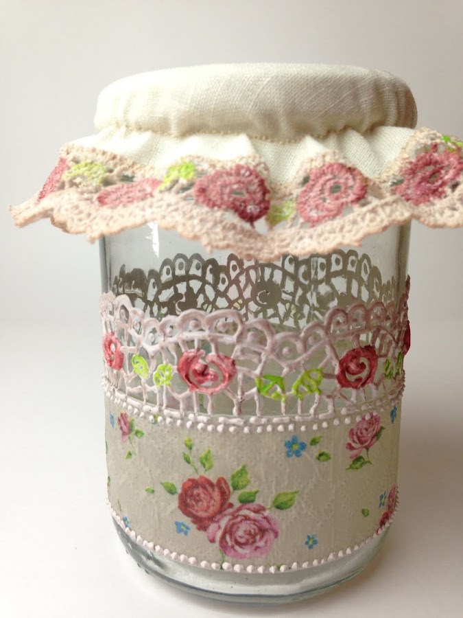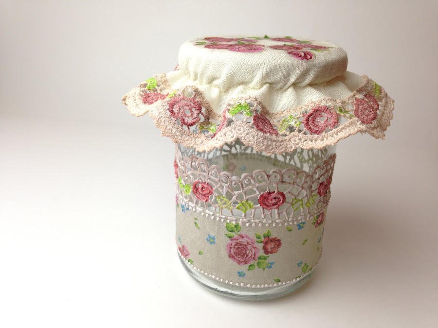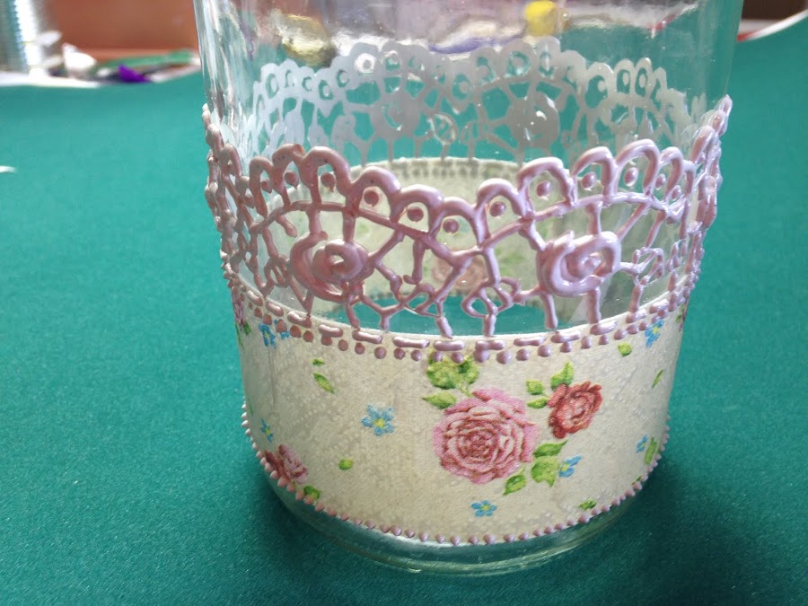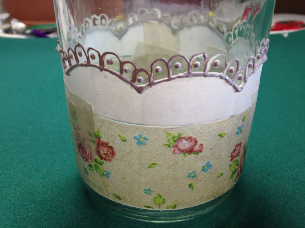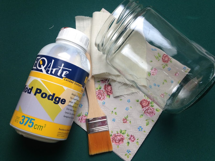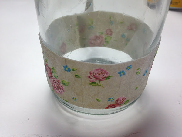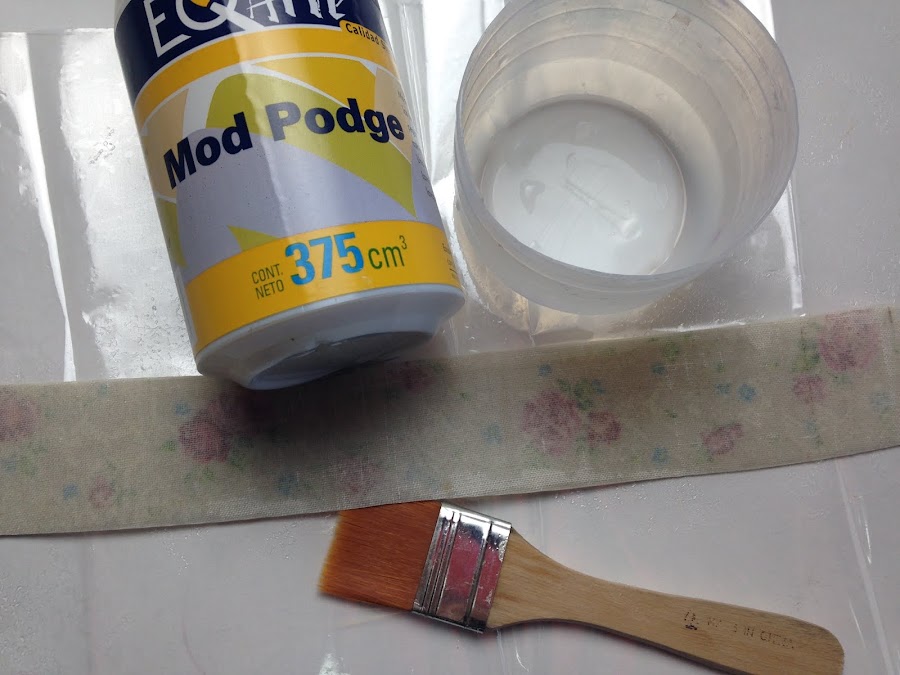 A la tira cortada se le coloca pegamento (Mod Podge) y se pega en el frasco en la posición elegida. Es conveniente sujetar algunas partes con cinta de papel para que no se mueva.