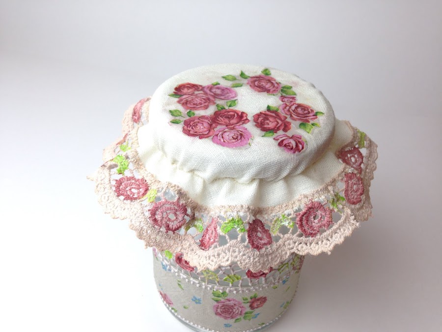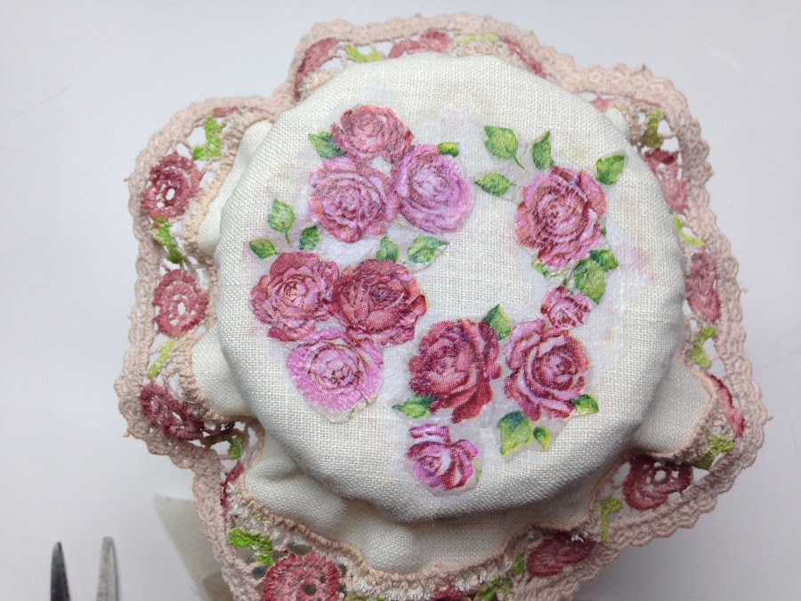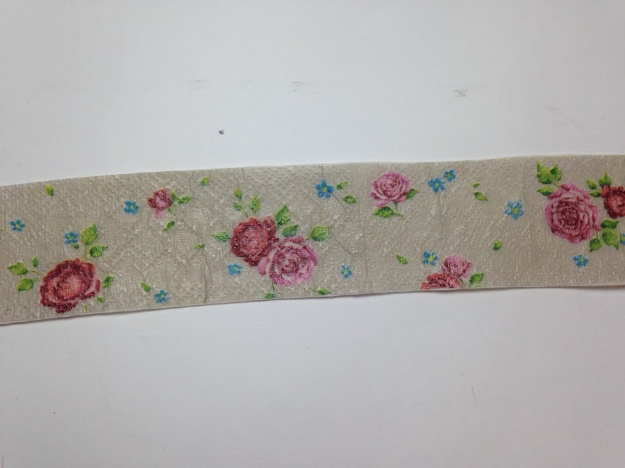 En la parte de arriba de la cofia le aplique trocitos de servilleta, rosas recortadas y las pegue con mod podge igual que la servilleta de guarda.