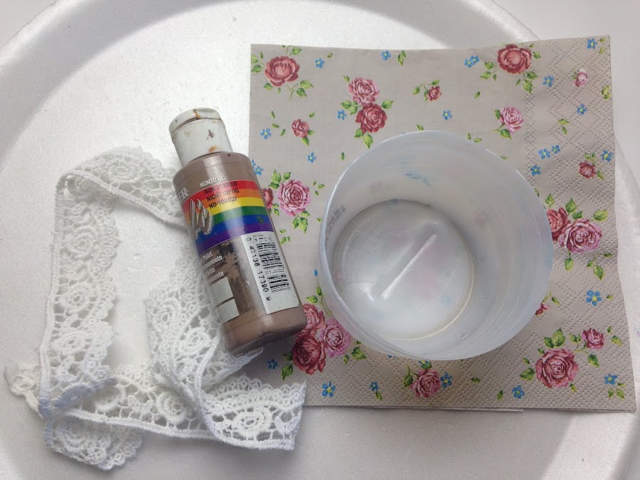 Para la cofia usé una puntilla de algodón pero como es de color blanca decidí teñirla a un color parecido al fondo de la servilleta. Para ello usé pintura acrílica, coloqué un poco en un recipiente, de a poco agregue agua y sumergí la puntilla unos minutos, luego la escurrí y la deje secar. Una vez seca la planché para afirmar el color.