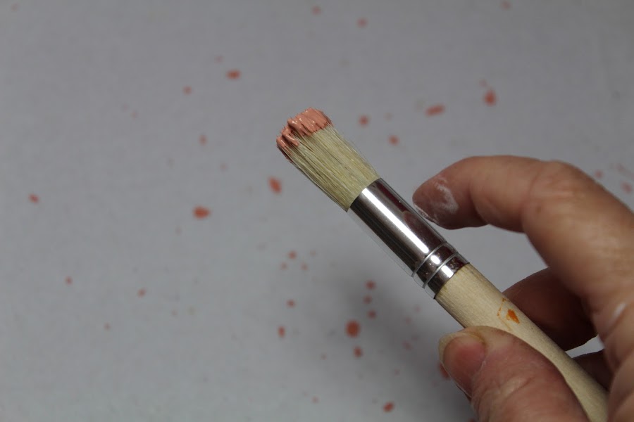 El método es el siguiente: cargar el pincel de pintura y darle golpecitos para que la pintura caiga de forma irregular en forma de gotas de distintos tamaños y formas.