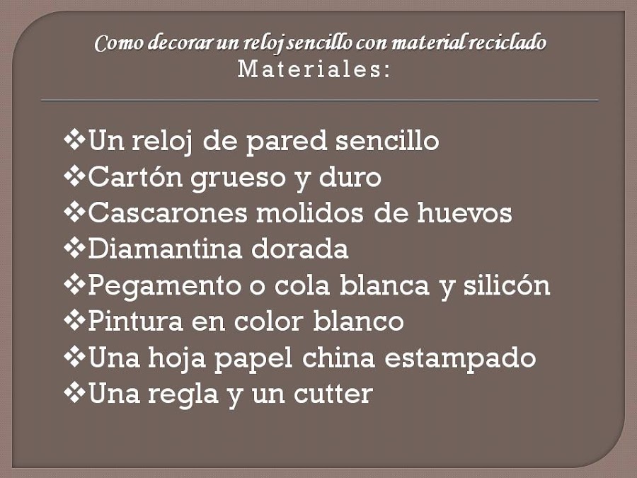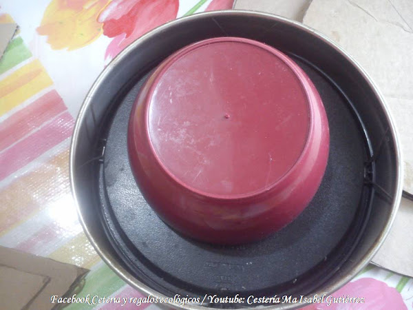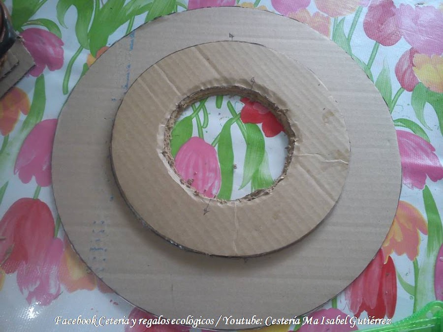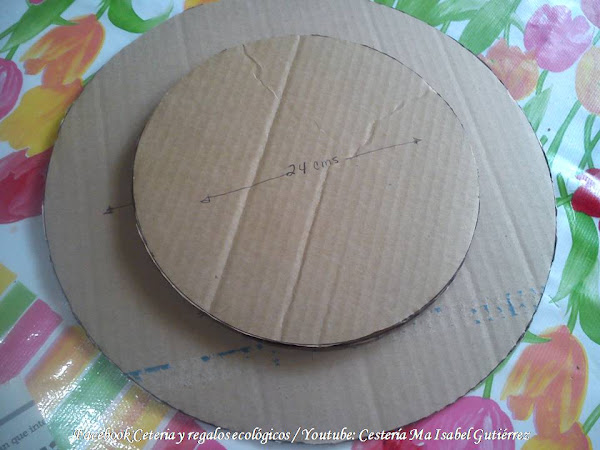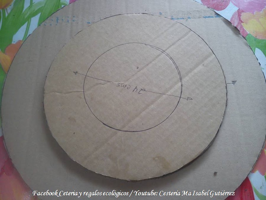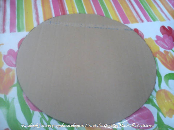 Lo primero que haremos es dibujar y cortar un círculo de cartón grueso y duro, debe ser mas grande que nuestro reloj (aproximadamente unos 15 cms., mas grande), podemos usar como molde alguna vasija redonda....