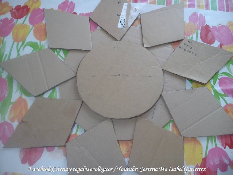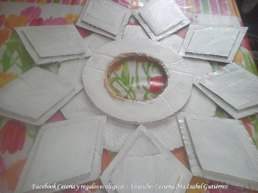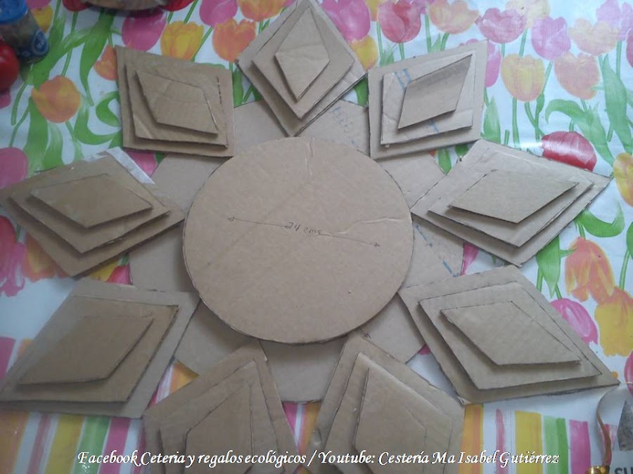 En base al molde, cortamos tantos rombos en cartón grueso y duro como necesitemos para pegar alrededor de los círculos de cartón mas pequeños, los que van al centro, considerando que la parte mas corta de los rombos, van hacia dentro. Aún no debemos pegarlos, la imagen es por el momento, solo ilustrativa...