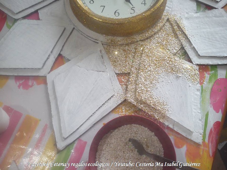 Con silicón frío, pegamos el reloj centrando bien. Para que combine con la decoración, lo pinté con pintura acrílica dorada y dejé caer un poco de diamantina dorada...