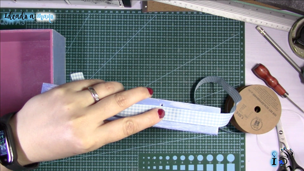 Luego pongo el lazo en la tapa, yo uso uno azul con cuadritos de Vichí. lo meto por las ranuras que tiene la tapa y en la parte inferior hago un lazo decorativo.