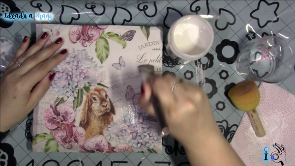Ahora ya es el momento de hacer el decoupage en la tapa. Recorto el papel con un poco de sobrante, humedezco el papel y hago el decoupage.