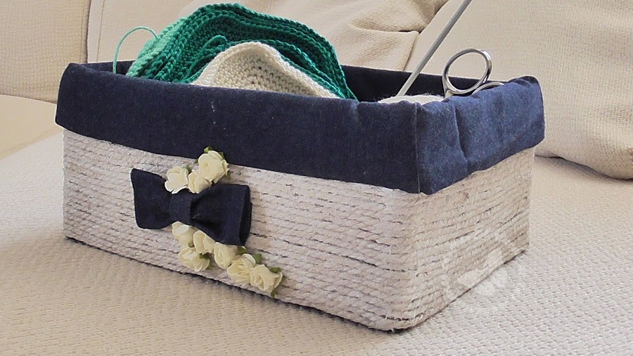 Lo primero será cortar la piezas para forrar la caja con la tela elegida en el interior dejando un doble de un par de dedos para el exterior y una pieza para la base. En mi caso lo haremos con una tela vaquera. Una vez pegada la zona de la base iremos pegando la cuerda con silicona caliente. Una vez forrada tan solo quedará ponerle unos adornos a nuestro gusto.