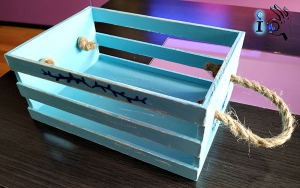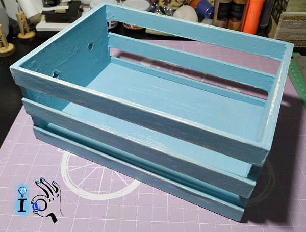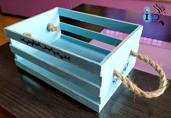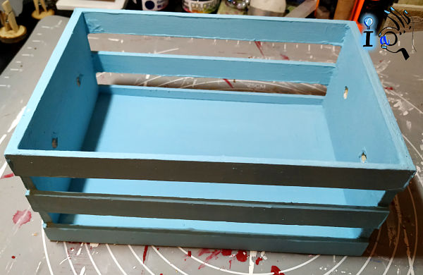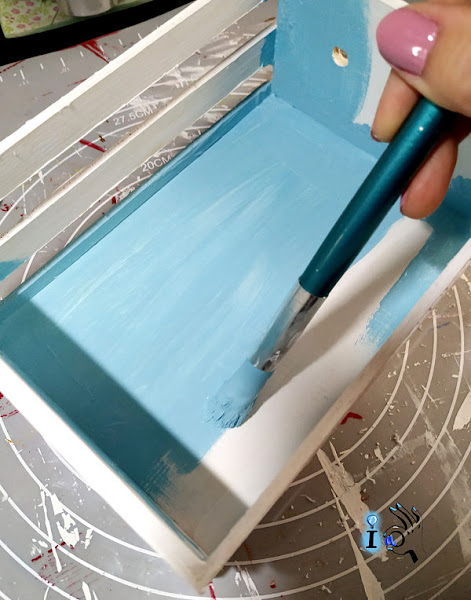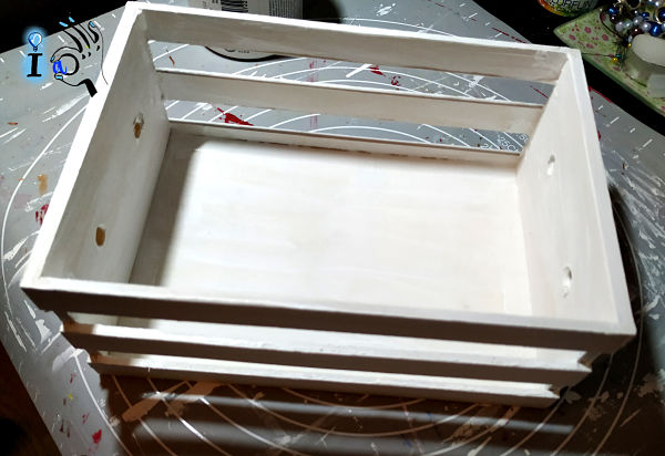 Lo primero es quitar las asas (y guardarlas para el final) y dar una lijada con una lija de grano fino a toda la caja, para quitar posibles astillas que pueda tener. Luego damos una capa del color que queramos que quede debajo, en mi caso blanco, y como uso pintura a la tiza no necesito poner imprimación previa (si no ponedla que la madera además chupa mucha pintura)