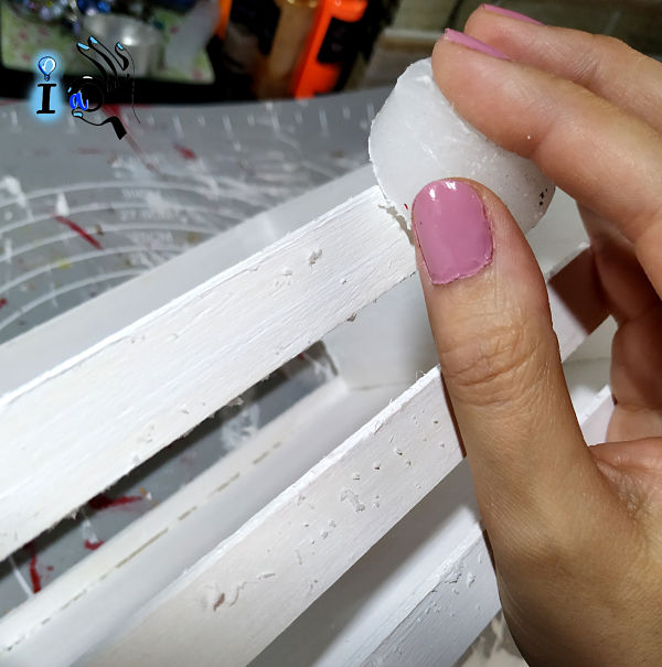 Cuándo está bien seco pasamos a hacer el decapado, con una lija fina lijamos por las zonas de desgaste natural de la caja, que serán las zonas por dónde hemos pasado la vela. Ya veréis qué facil es decapar si antes has puesto la cera...
