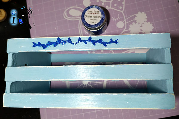 Con esto ya nos quedaría una caja bien mona. Pero yo le quiero añadir un detalle, y tenía comprada y sin estrenar una mousse o pasta de relieve azul brillante super mona, así que usé una plantilla para ponerle un detalle: