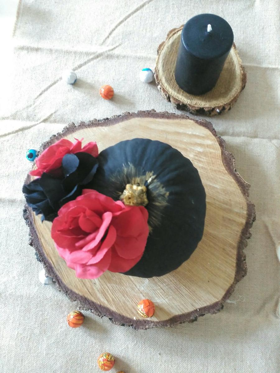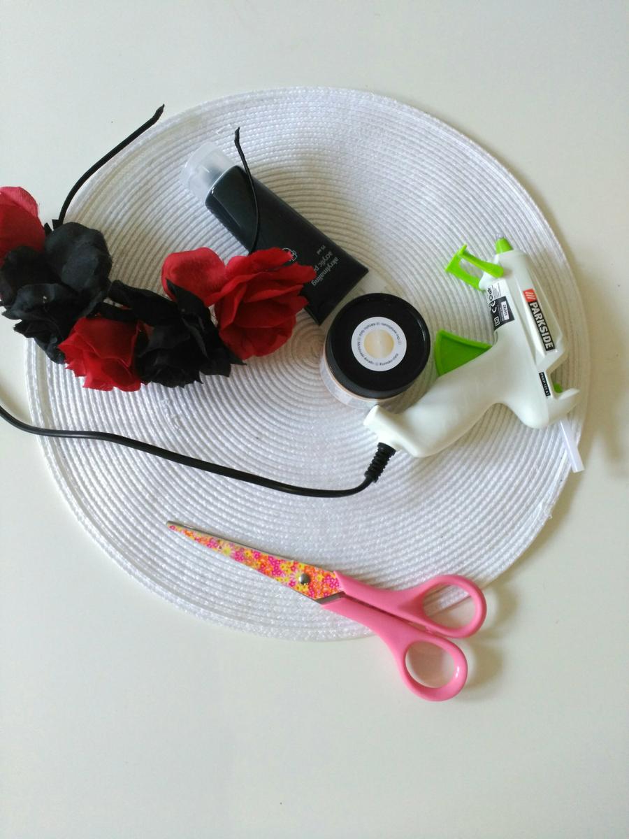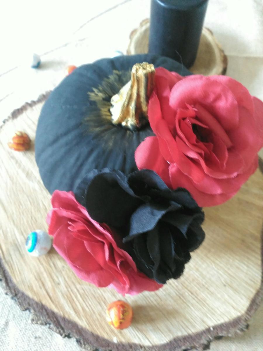 He comprado una calabaza pequeña que he pintado de negro y dorado con pintura acrílica, no suelo usar este tipo de pintura, siempre uso chalk paint, pero la verdad que me ha encantado el resultado. Ya os comenté en el post anterior, que este año Halloween se presenta austero, tampoco tenemos mucho tiempo, así que lo que estoy preparando es muy rápido. Nuestra vida está siendo muy complicada últimamente, así que me ha pillado un poco el toro. La semana pasada me dí un pequeño paseo por tiger y compre una diadema de flores, pensando en hacer algo con ella y entre sueño y sueño se me ocurrió esta tontería. Espero que os guste y os sirva de inspiración.