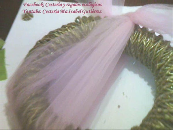 Amarramos la tira de tul, o puedes usar cualquier tela lisa, haciendo un nudo simple como se ve en la imagen, rodeando una parte de la corona...