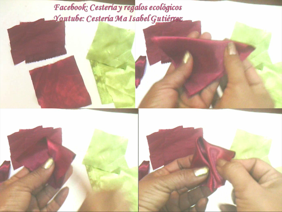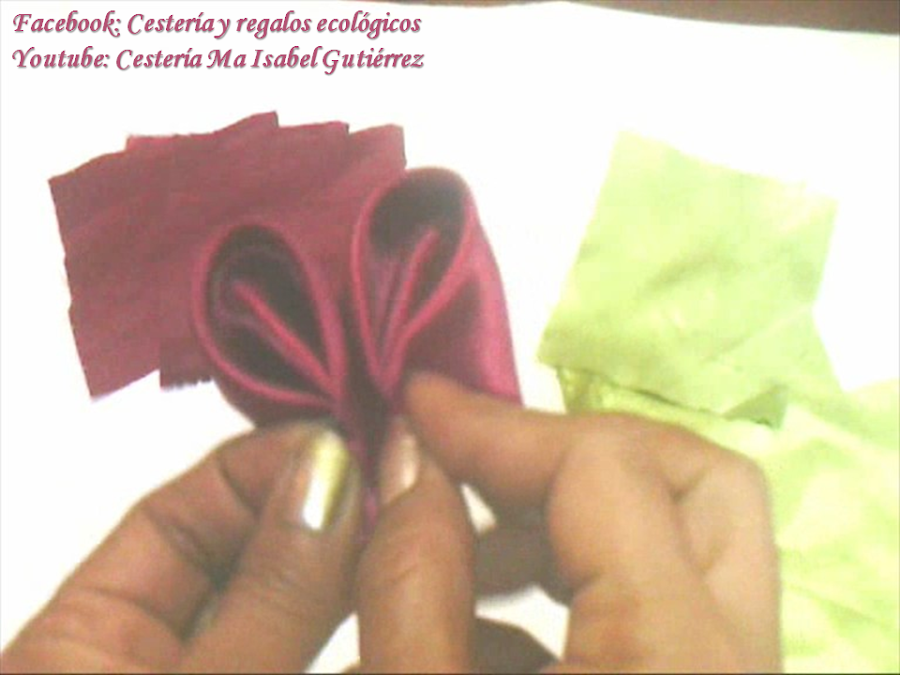 Vamos a recortar cuadrados de tela. Cada cuadrado es un pétalo y la flor lleva seis pétalos, así que corté 30 cuadrados para hacer cinco flores, las medidas del cuadro son opcionales según lo grande que deseamos las flores. Los cuadros verdes también son pétalos pero los usamos como hojas... Tomamos un cuadro, lo doblamos a la mitad formando un triángulo, luego tomamos la esquina derecha del triángulo y la llevamos hacia abajo, hacemos lo mismo con la esquina izquierda, entonces se forma un cuadro, ahora vamos a doblar ese cuadro hacia atrás...