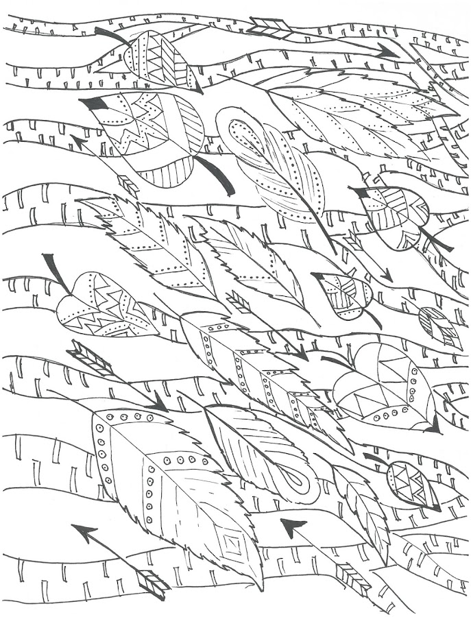 Para el diseño de las cajas escogí un fondo de hojas y elementos del bosque en blanco y negro, así los peques podrán colorear las cajas y como la forma es triangular, crear un TIPI con ellas. Hice el dibujo a mano y luego lo lleve a la copisteria donde les pedí que me lo pasaran a un archivo JPG con una resolución de 300ppp y un perfil de color RGB.