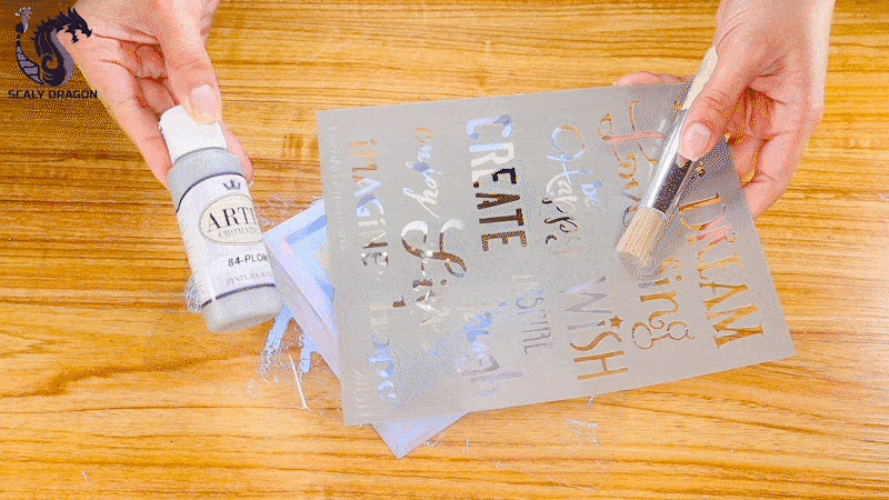 Luego Colocamos el stencil en el área donde mas nos guste en este caso lo colocare de forma diagonal, luego con el pincel de estarcir cargado de poca cantidad de pintura frotaremos constantemente y de forma circular hasta que nos guste como se vea, seguido retiramos el estencial y ya tendríamos lista nuestra palabra bonita.