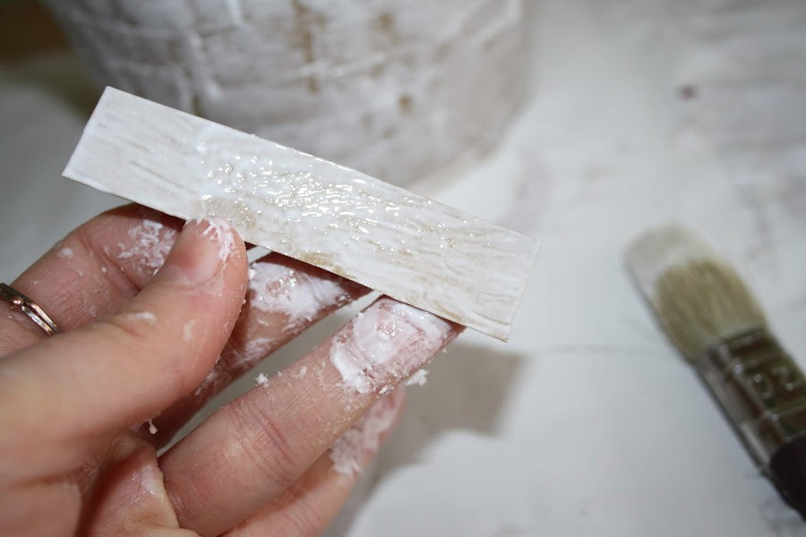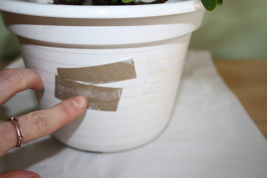 Pintaremos con pintura de tiza, daremos dos capas para que no se note tanto el efecto del papel y después pintaremos con color dorado (tanto en el borde como por toda la maceta)