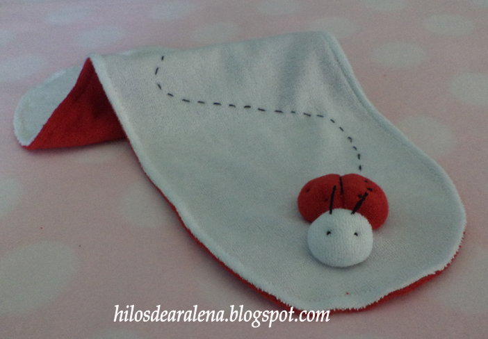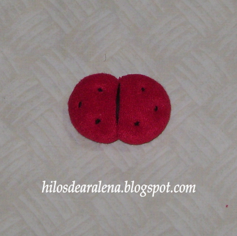 Fijamos la mariquita o vaquita de San Antonio a la prenda con unas puntadas por el revés , utilizando la pistola de silicona o pegamento para telas . Ustedes eligen .
