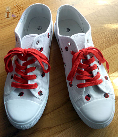 Ahora, según la pintura, convendrá dar calor para fijarla. Como planchar unas zapatillas es bastante difícil yo les dí calor utilizando la pistola de embossing, que coge bastante temperatura, pero un secador con bastante potencia también puede servir. Además unas zapatillas no es algo que lavemos tantas veces como una camiseta o unos pantalones.... De modo que ya tendríamos listas las mariquitas: