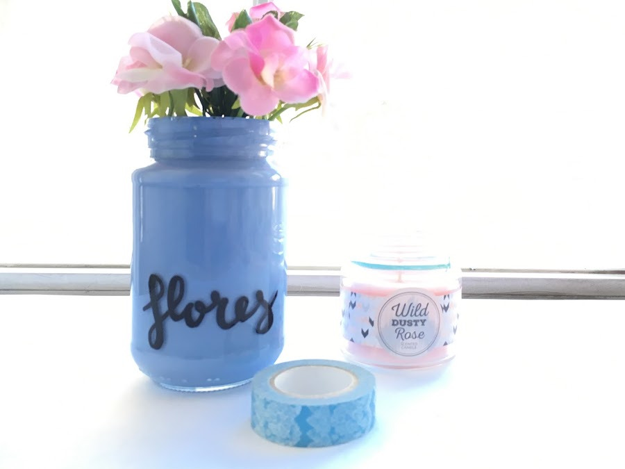Lo que hace falta es: un tarro de cristal reciclado, papel y lapiz, rotulador permanente, celo o washi y pintura. Yo he escogido un tono azulito de chalk paint de pinturas La Pajarita, que contrasta muy bien con el rosa de mis flores.