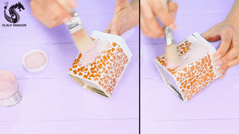Luego tomaremos las cascaras de huevo y con los deditos romperemos algunos trocitos medianos y los iremos colocando sobre la lata, seguido con los deditos y con ayuda de un palito iremos aplastando y acomodando los pequeños fragmentos de la cascara de huevo hasta que nos guste como se vean.