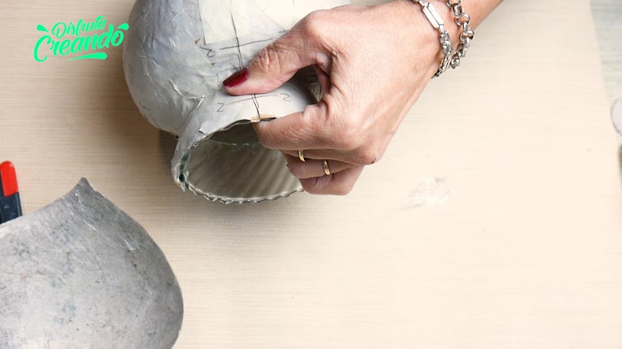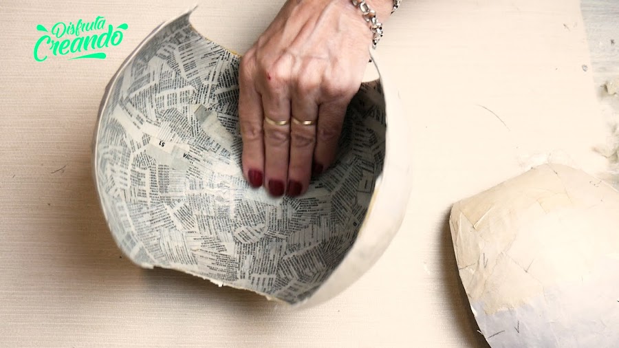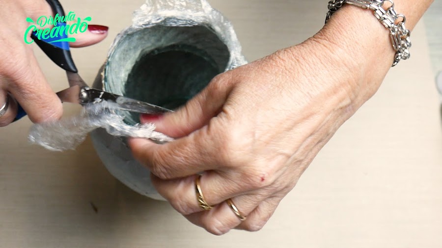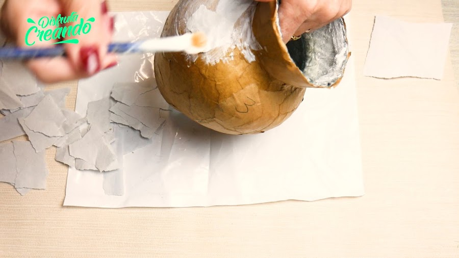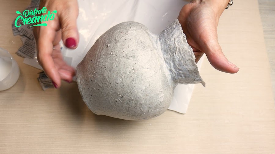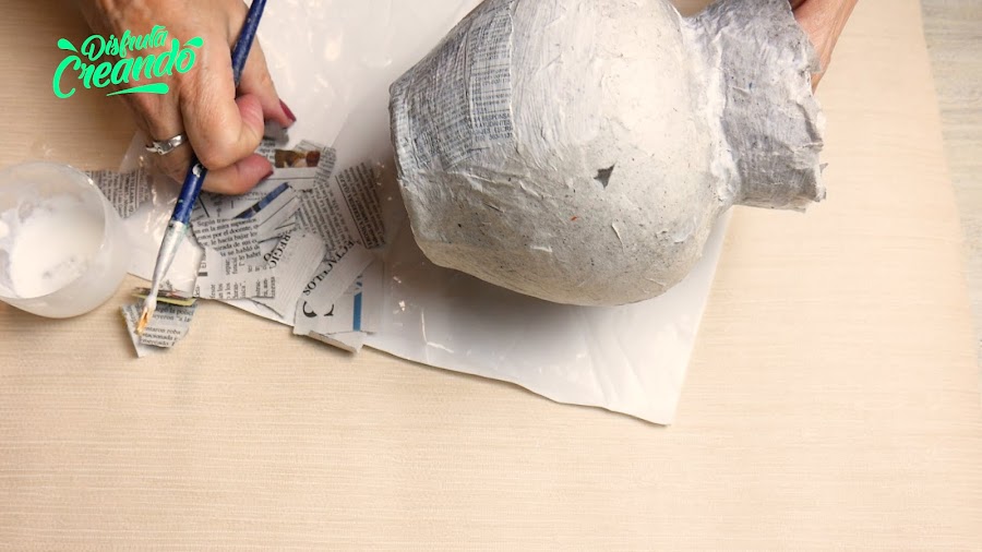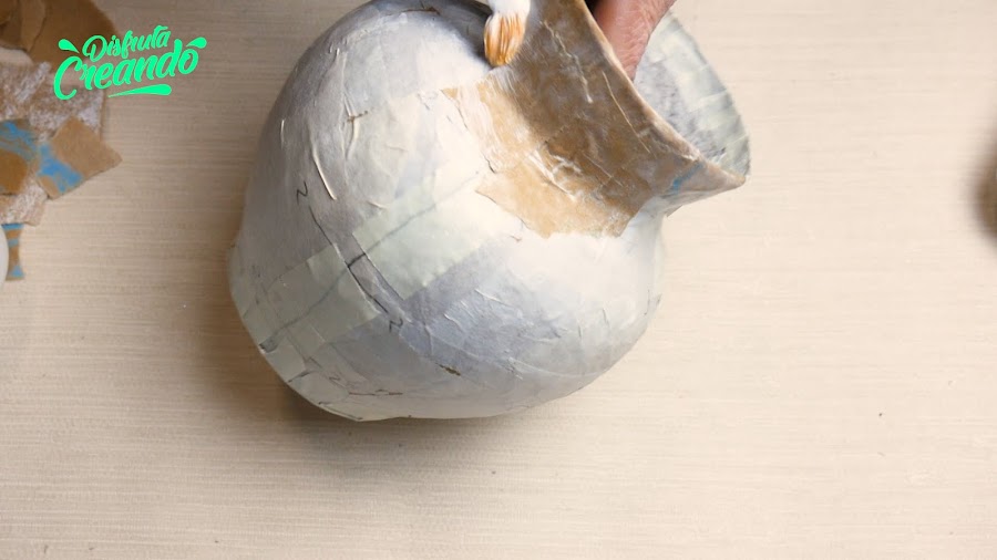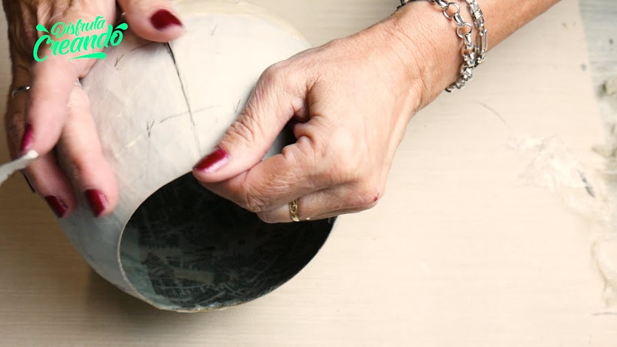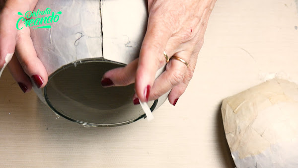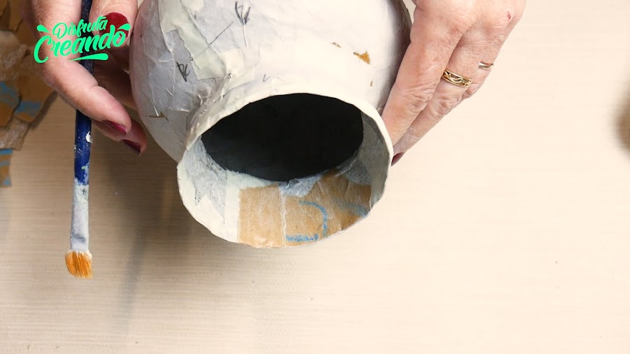 Ahora realizo una cartapesta final, incluyendo la parte interior de la boca del recipiente y cubro la totalidad de la pieza.