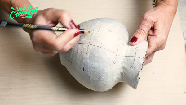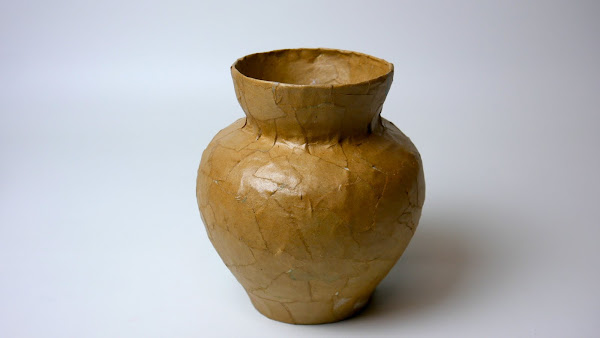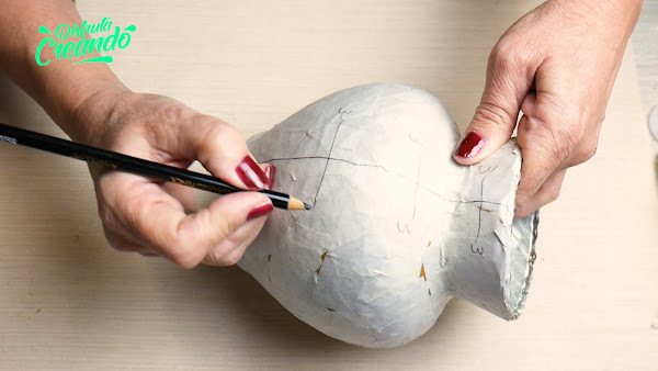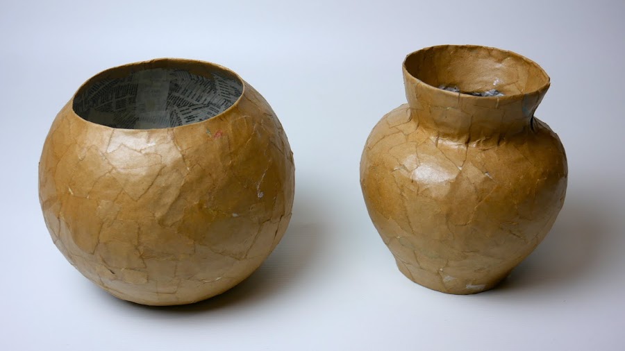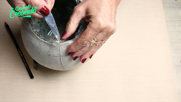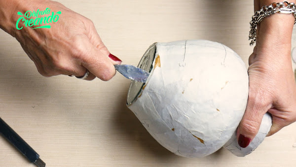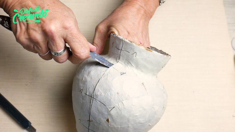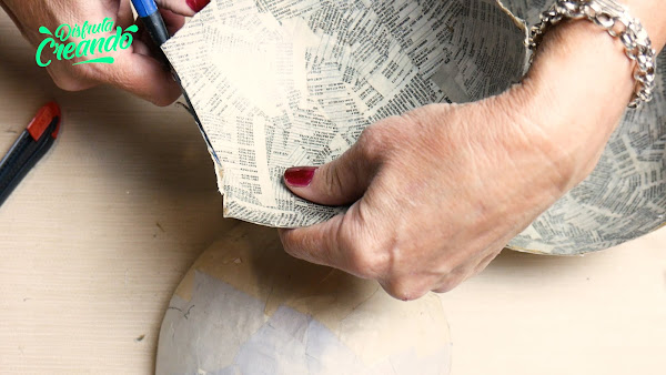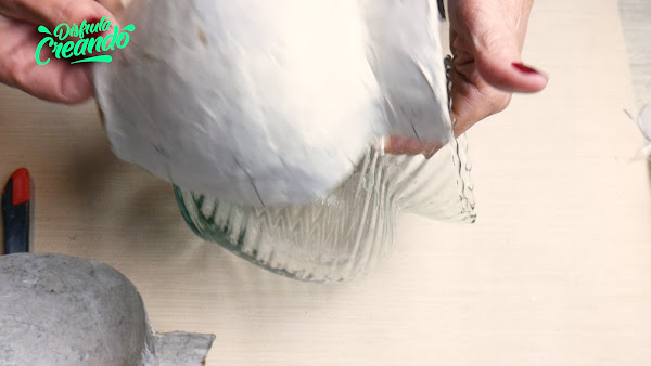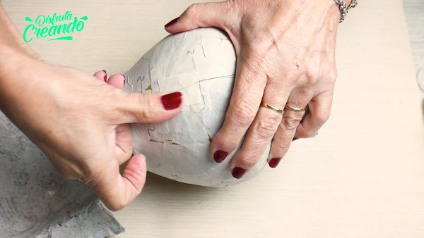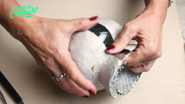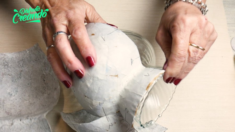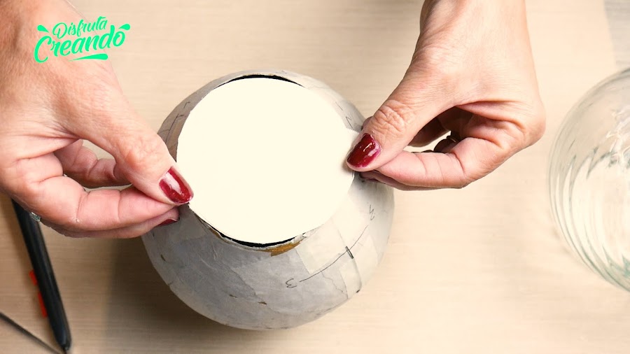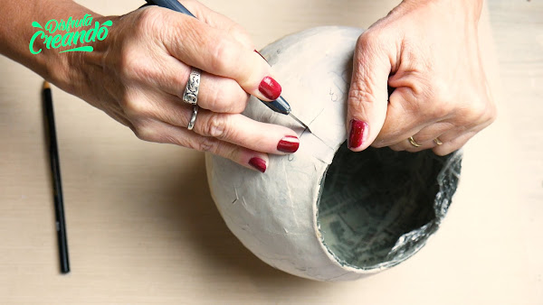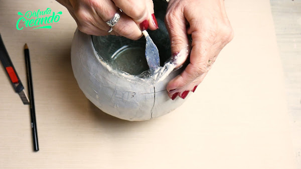 Ahora realizo una cartapesta final, incluyendo la parte interior de la boca del recipiente y cubro la totalidad de la pieza.