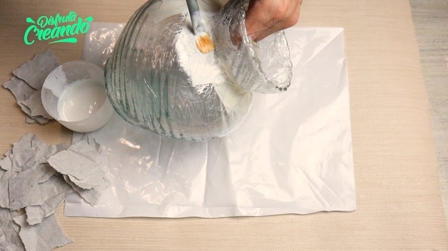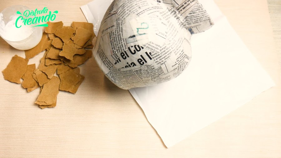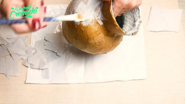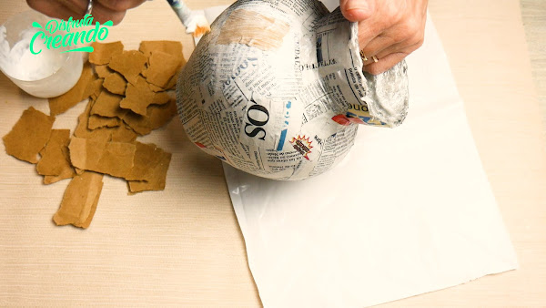 Una vez que termino con la primera mano de papel lo dejo secar un poco para que me sea más fácil mover la pieza y no se me pegotee en las manos.