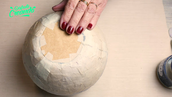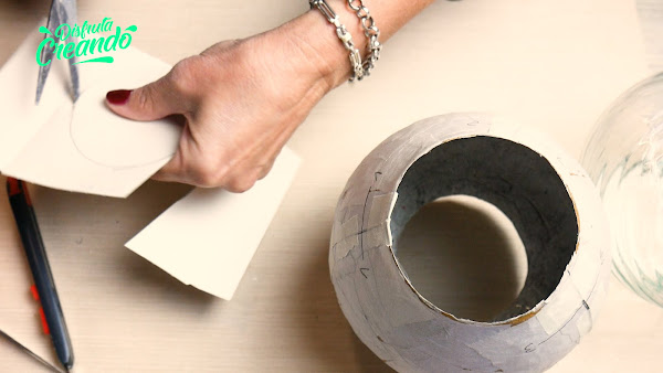 Ahora armamos la base, para eso con un trozo de cartón recorto un círculo y lo sujeto con cinta de papel para formar ahora sí la base. Pueden ver lo fácil que resulta hacerlo de éste modo.