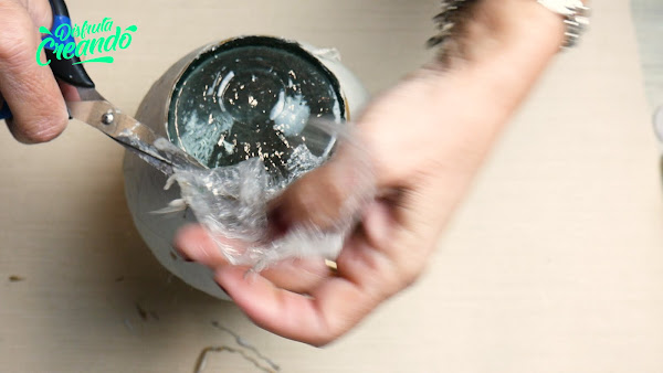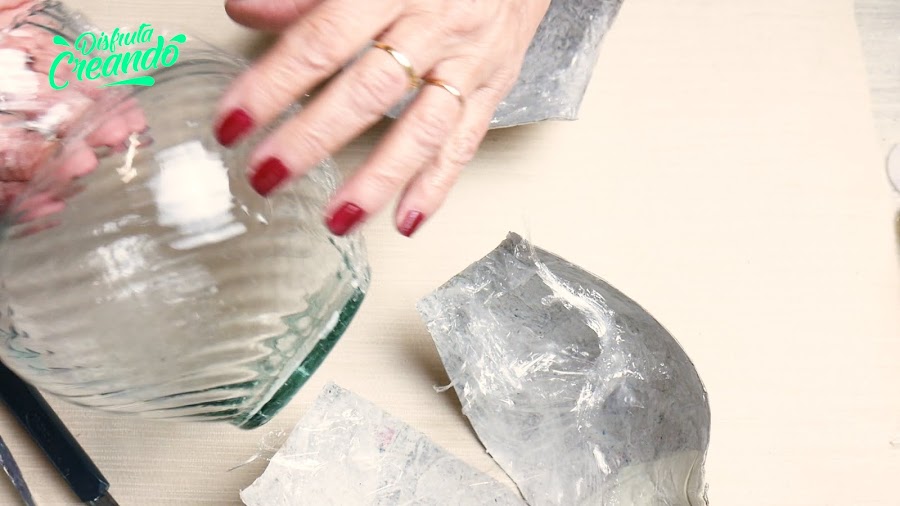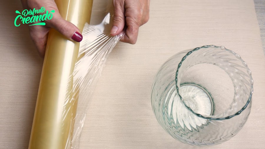 Luego con una cinta de papel trato de darle la forma al cuello del florero, aplastando ya que en este sitio el film no toma forma, una vez colocado alrededor la cinta sigo más abajo terminando de darle forma al cuello del florero.