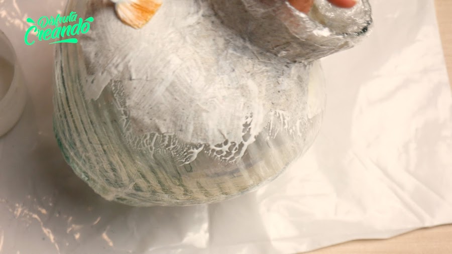 Comienzo a pegar en la zona del cuello del florero, utilicen recortes de papel pequeños para que tome bien la forma, incluso yo utilizo mucho mis dedos para aplastar el papel y quitar arrugas.