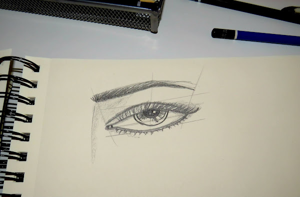 3. Usamos nuestro HB para hacer líneas intermedias. Aquí ya vamos dándole a nuestro ojo una forma más humana. Marcamos el boceto que hemos hecho y, además, añadimos los primeros detalles.