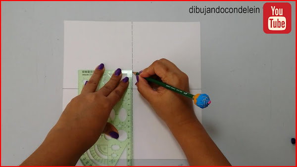 Comenzamos por ubicar el centro de nuestra area de trabajo, dividiendo nuestra hoja en dos tanto vertical como horizontalmente y trazamos unas lineas justo en el centro, formando una cruz.