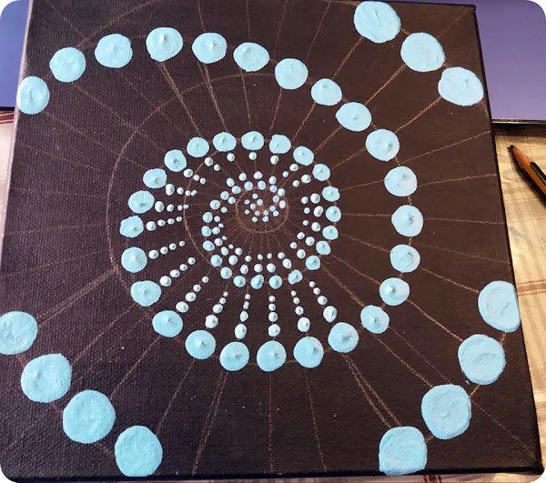 He esperado a que estuviese seco para trazar con un lápiz una línea desde cada punto hacia el centro , esto no es necesario pero es una muy buena guía para que todos los puntos que hagamos a partir de ahora confluyan hacia el punto central del motivo.