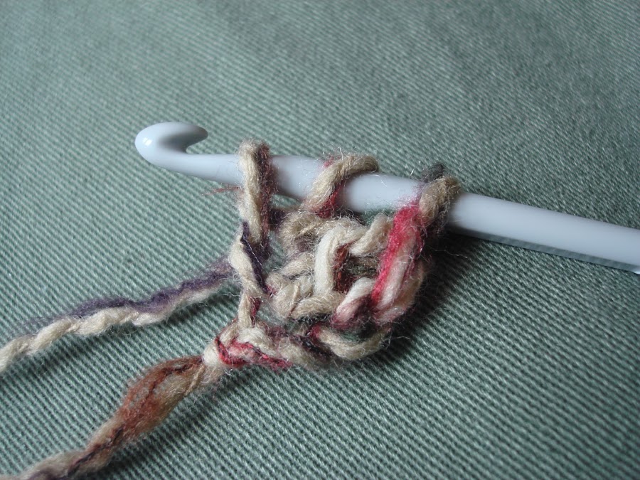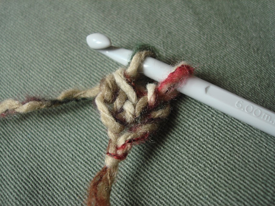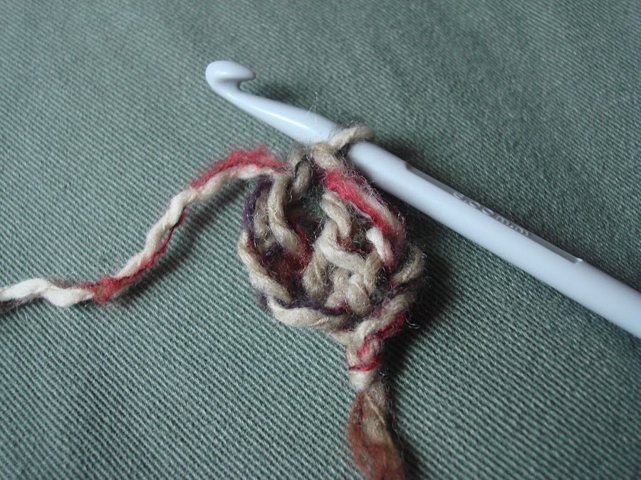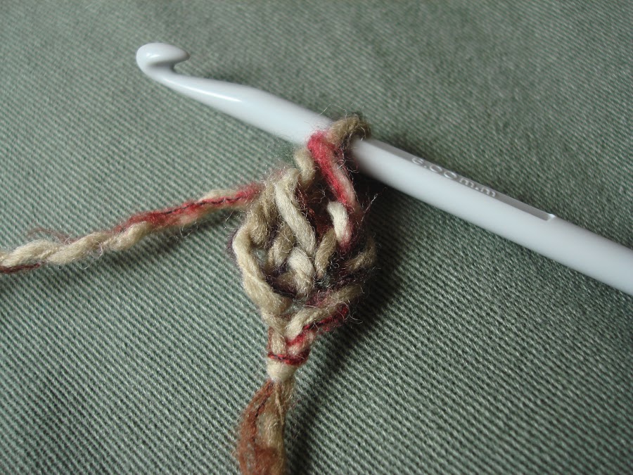 3.- En vez de coger hebra y cerrar las dos primeras lazadas, lo que hacemos es una cadeneta con la última lazada que tenemos. Creo que se ve bien en la foto.