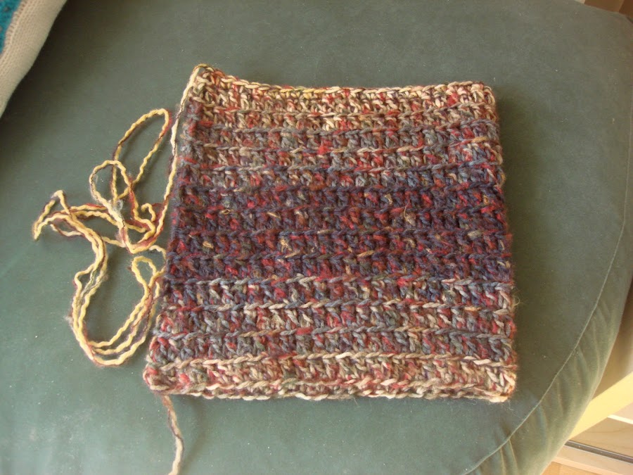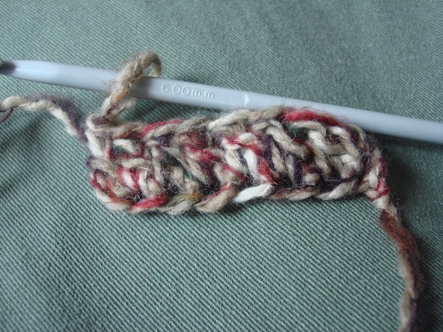 Tenia un ovillo que compre a mi hijo para hacer un cuello o braga a punto, y que luego no le gusto y andaba por ahí rodando, así que después de un par de intentos para hacerme un gorro y ver que no tenia suficiente lana, decidi hacer un cuello, pero a ganchillo, simplemente con palotes, y así probar la técnica nueva que he aprendido de empezar sin cadeneta.