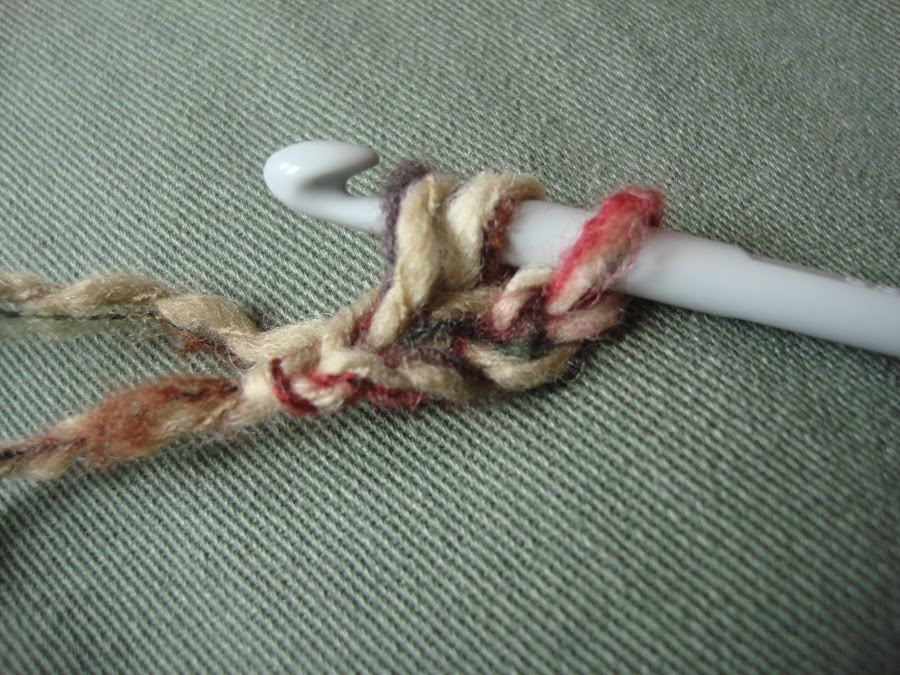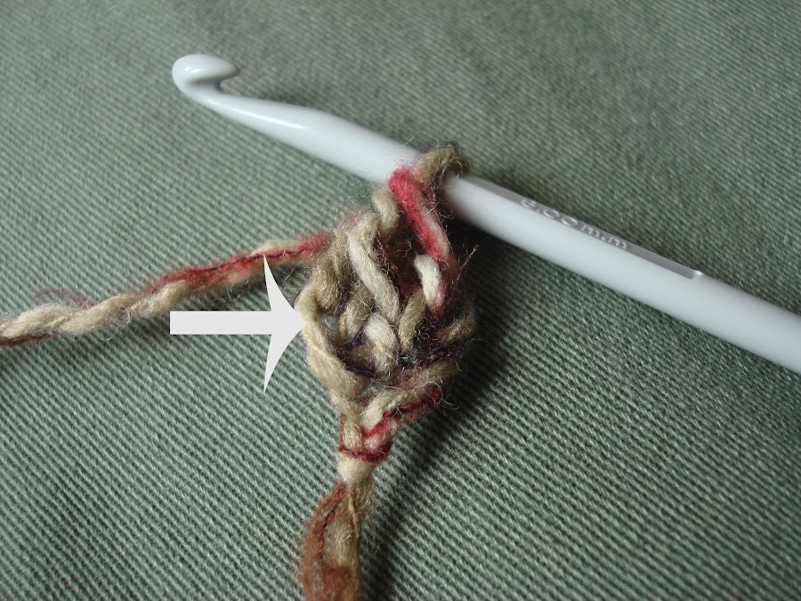 6.- Para hacer el siguiente punto, volvemos a coger hebra y pinchamos en la cadeneta que habiamos hecho antes. Es decir pinchamos el ganchillo donde indica la flecha