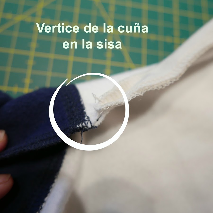 22. Ahora, para finalizar, remataremos la zona de la sisa. Donde se junta con la cuña lateral. Simplemente con pasar un zig zag con la máquina de coser o con la remalladora: