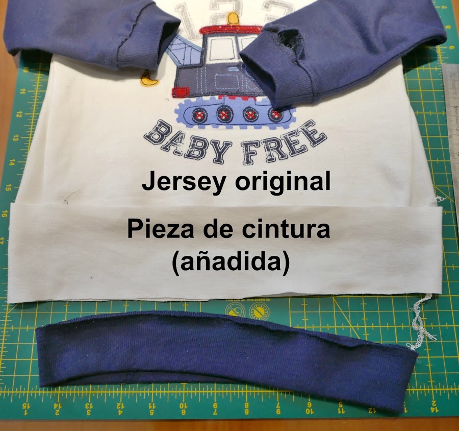 Importante: Recordar que la zona de la pieza cintura, debe ser algo más ancha que el elástico del jersey. De este modo el elástico cumple la función de embeber.