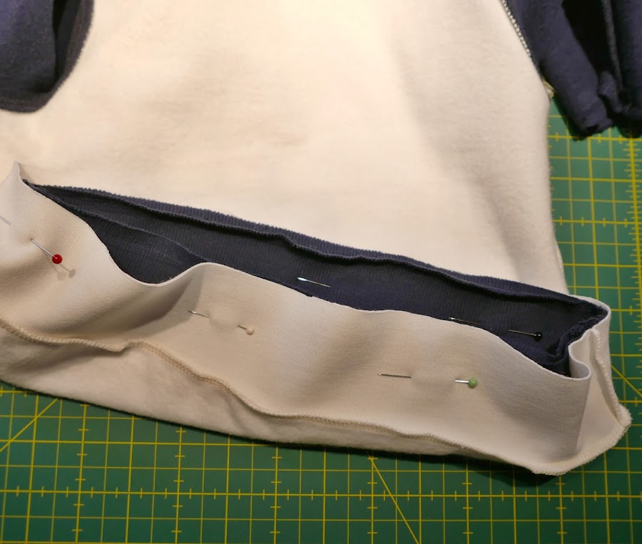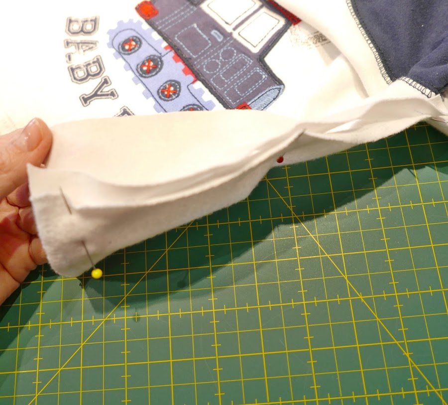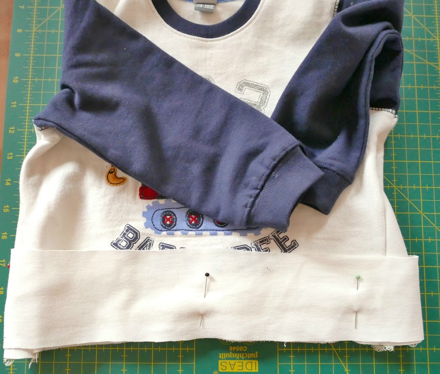12. Vamos colocando la pieza extra al jersey con alfileres: