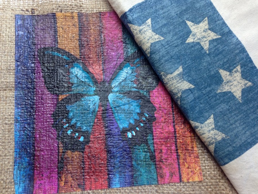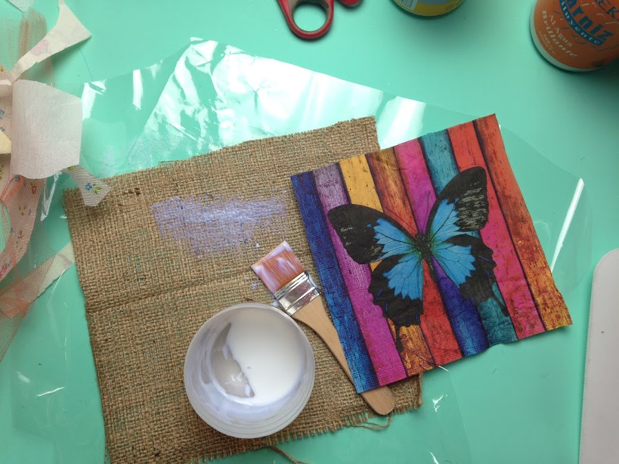 El entelado de servilletas se trata de pegar con pegamento servilletas de papel a una tela (cualquiera).